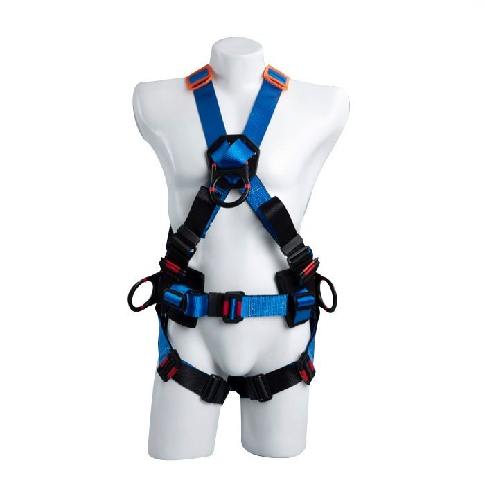 Cuerpo entero ajustable en torso y piernas para aplicaciones de detención de caídas o restricción, sus argollas, hebillas en nylon inyectado para evitar la conductividad eléctrica, con su argolla dorsal en «D», para ascenso y descenso controlado por su argolla en «D» frontal y posicionamiento, con faja lumbar para mayor Comodidad el cual incluye portaherramientas. Fabricado en reata de poliéster de 45 mm de ancho. CALIDAD CERTIFICADA SGS ANSI/ASSE Z359.11-2021