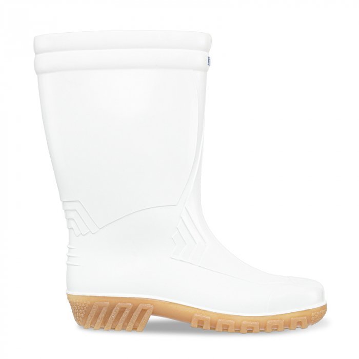 Botas para trabajo de protección fabricadas en PVC y certificadas por Icontec con sello de producto de calidad bajo los requerimientos de la norma ASTM F2892-18. Es de caña blanca con suela crepé. Su suela es de labrado profundo, lo que mejora el agarre y facilita la remoción de fluidos. Tiene un forro interno en poliéster tejido rizo y trae un puente estabilizador para el pie.