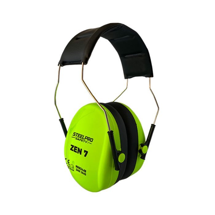 Protector Auditivo tipo copa ZEN 7, con bandas metálicas, liviano, resistente y ajustable, color verde alta visibilidad NRR 24dB/SNR 29dB